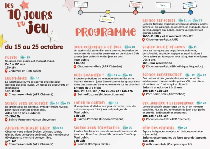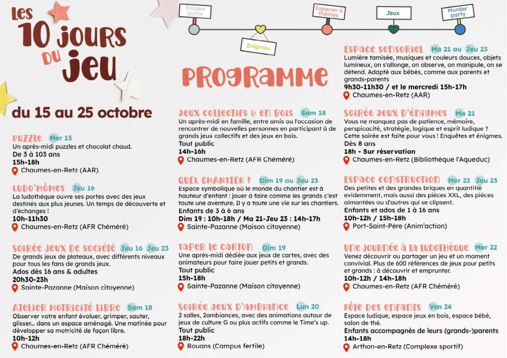 jeux de plateau, jeux de cartes, jeux de construction, jeux de stratégies, jeux en bois, jeux extérieurs, petits instruments de musiques, jeux créatifs, casse-tête, jeux de coopération…