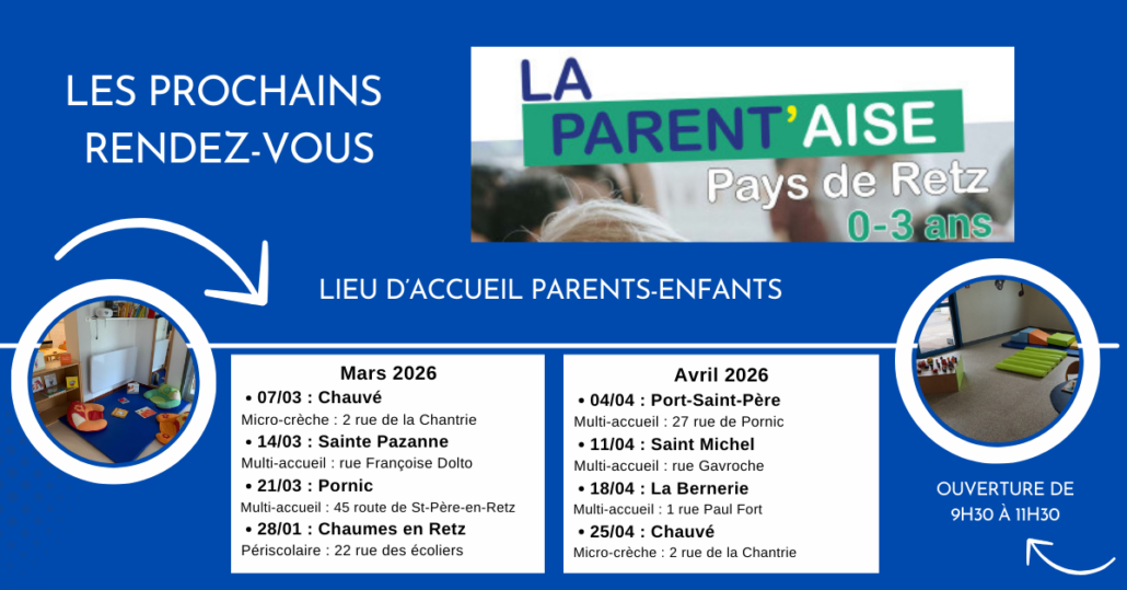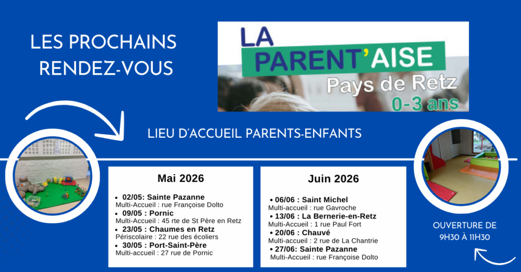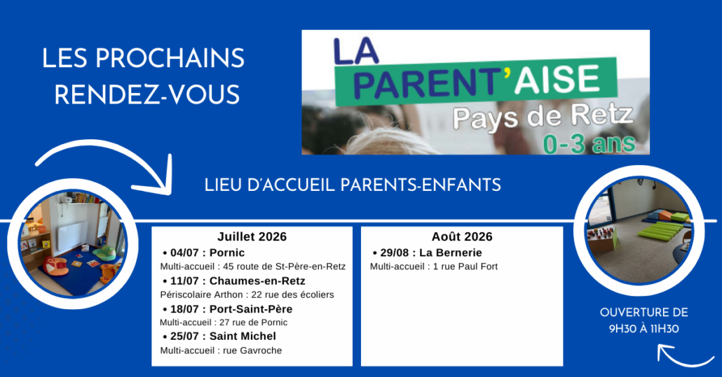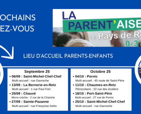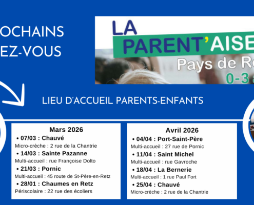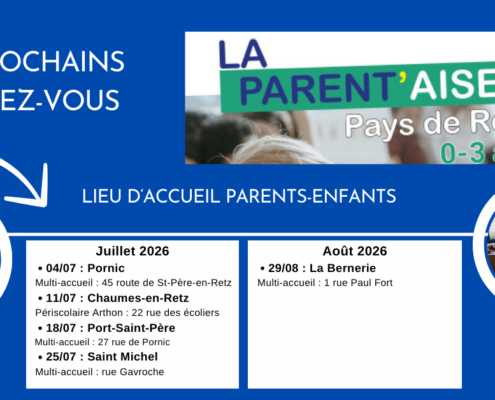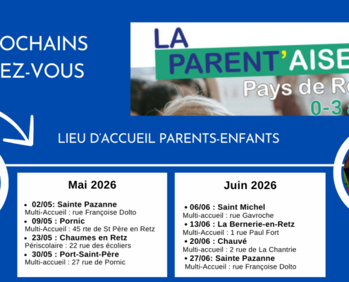 La parent’aise vous est proposée par les associations Roule ta bille (la Bernerie), Paz à Pas ( Sainte Pazanne), la Maison des Enfants (Chauvé),  Anim’Action ( Port-Saint-Père), Croissance (Pornic), AAR (Chaumes En Retz) et Pornic Agglo Pays de retz.
